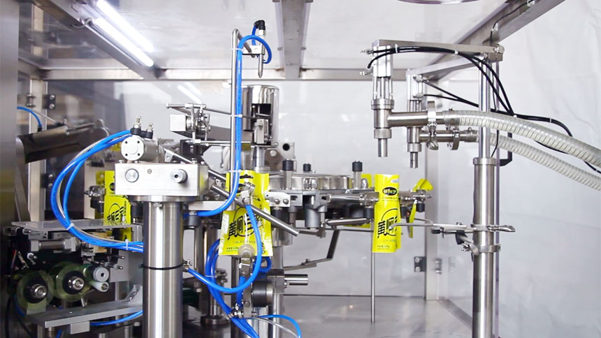 這套全自動(dòng)給袋式液體醬體包裝機(jī)主要適用于液體/醬體類:洗滌劑、黃酒、醬油、米醋、果汁、飲料、番茄醬、花生醬、果醬、辣椒醬