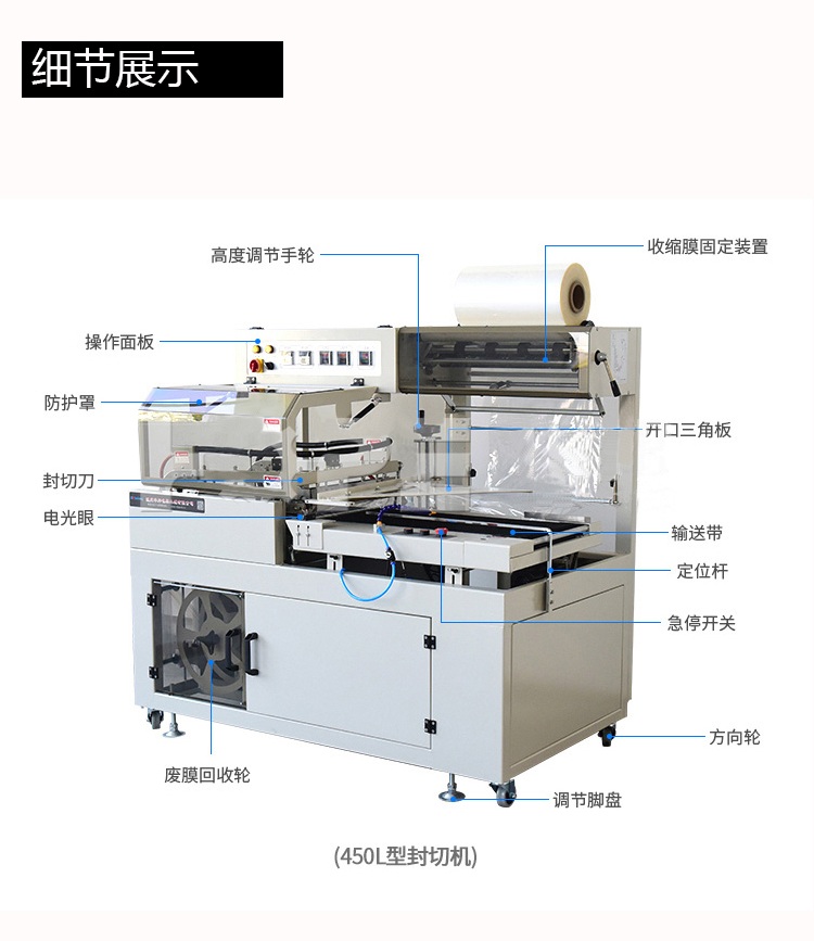 配合L型封切刀使收縮膜包裝一次封切成型,鍍特氟龍不粘層封口布,封切不黏膜,且封口整齊不開裂,產品經封切后,進入自動塑料膜熱收縮包裝機完成包裝。